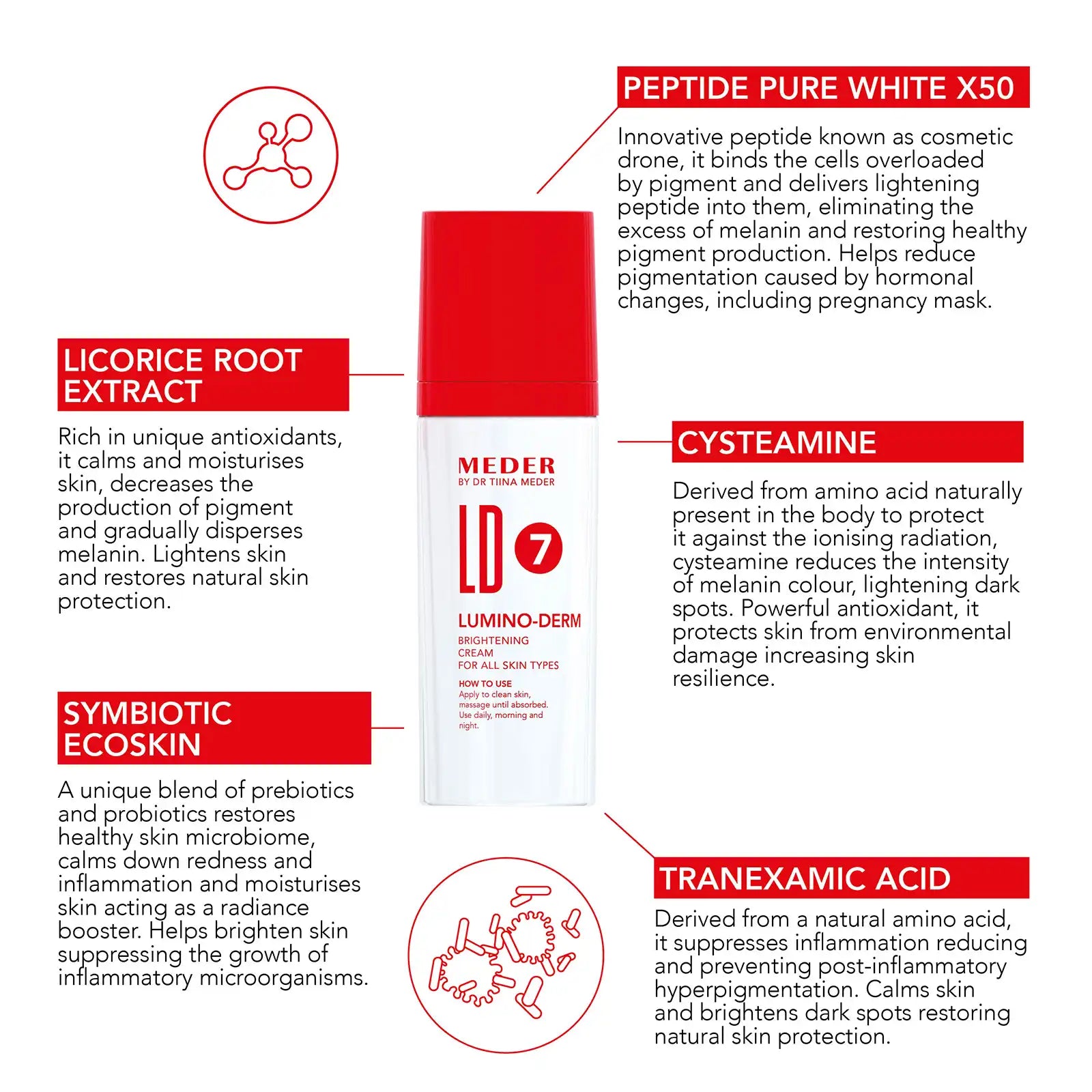 Lumino-Derm verheldert de huid niet alleen, maar kalmeert ook en verbetert de weerstand tegen uv-schade. Deze innovatieve formule is geschikt voor alle huidtypen en zorgt voor een natuurlijk egale en stralende teint zonder het ongewenste halo-effect. Bovendien verhoogt het de gevoeligheid van de huid niet, waardoor het veilig te gebruiken is, zelfs tijdens zonnige periodes, in combinatie met regelmatige zonbescherming.