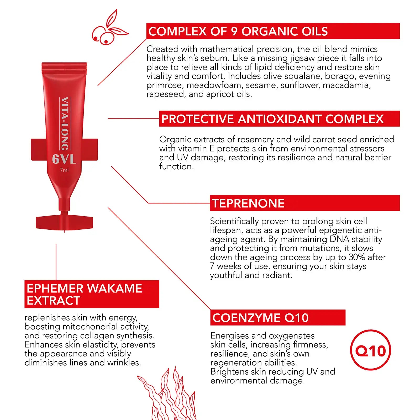 Vita-Long is een revolutionaire anti-aging gezichtsolie die het verouderingsproces van je huid op natuurlijke wijze vertraagt. Deze olie, samengesteld uit een mix van tien biologische oliën, waaronder squalaan uit olijfolie en teunisbloem, bootst de beschermende laag van een jeugdige huid na en herstelt en vult de huidbarrière direct aan.