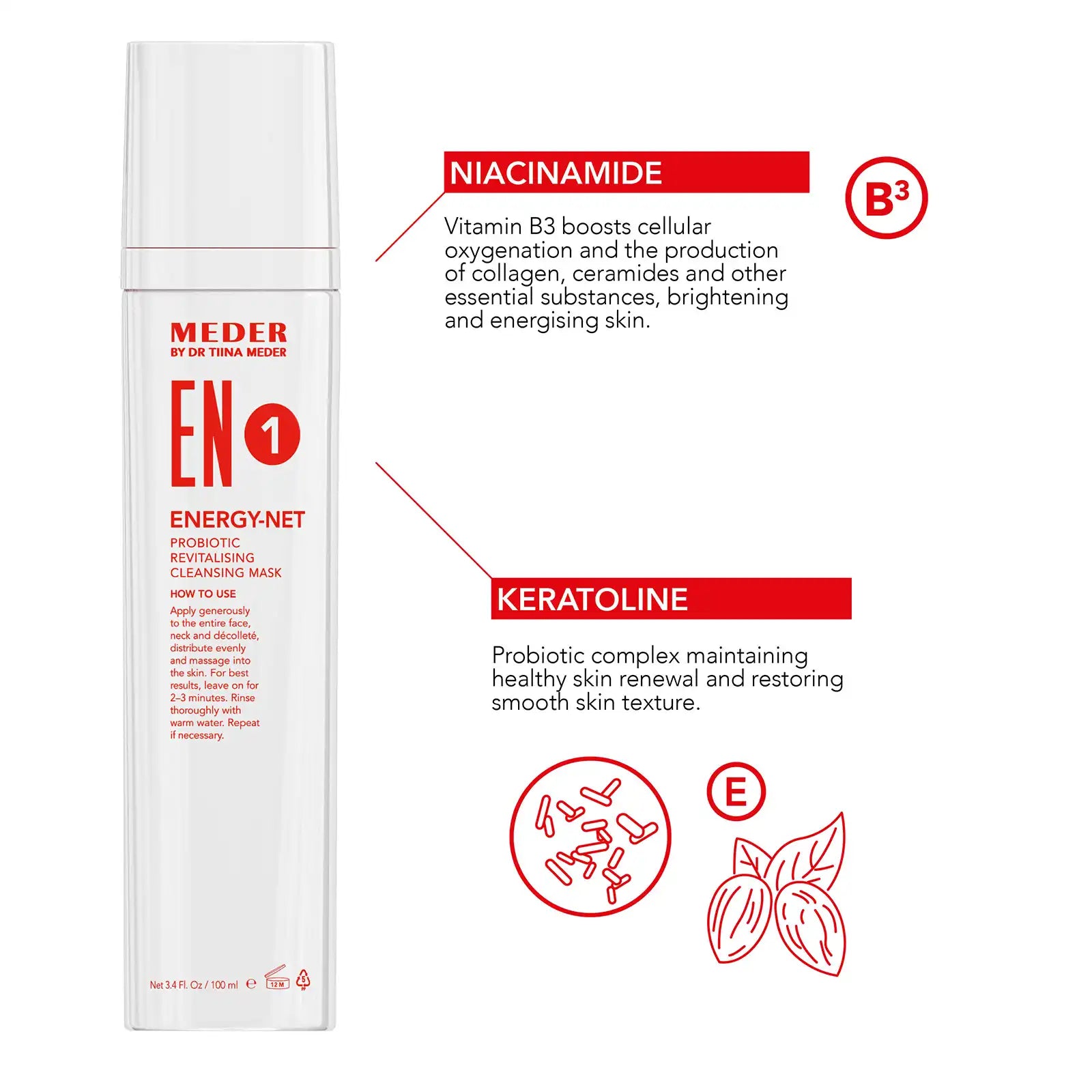 Energy-Net activeert de microcirculatie, levert zuurstof en geeft de huidcellen energie voor een frisse uitstraling. Verrijkt met probiotica exfolieert het op een milde manier en bevordert het een gezonde huidvernieuwing. De toevoeging van niacinamide verbetert de veerkracht van de huid, helpt rimpels te voorkomen, verheldert pigmentvlekken, verkleint poriën en zorgt voor een gladde, jeugdige teint.